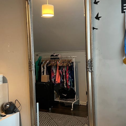 Myydään ovaalin mallinen peili. Vasemmassa laidassa on takaa puuttuva pala, joka ympyröity kuvasta. Koko 117cm korkea ja 49cm leveys.