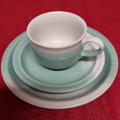Kuvanmukainen pari kahvikuppeja aluslautasella