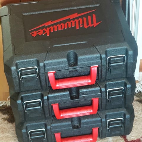Täysin ehjä ja tarpeeton akkukoneen muovisalkku.
