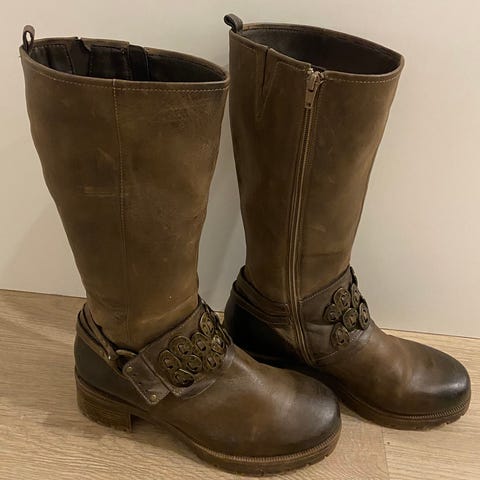 Ruskeat pitkävartiset talvisaappaat, nahkaa. Koko 7, vastaa kokoa 40. Joustava kumipohja eli hyvät kävellä.
