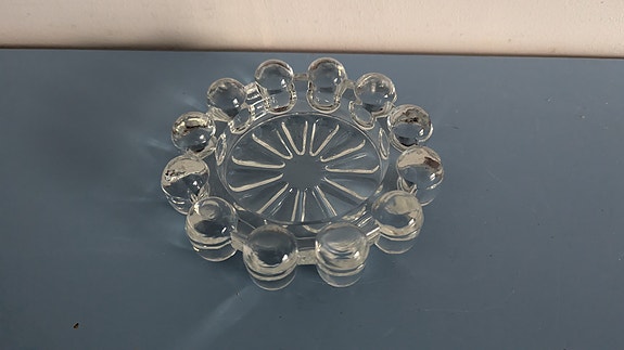 Ei iskemiä tai halkeamia. Pohjassa naarmua siirtelystä. Itse lasimassassa, juurikin raaka-aineen ja valmistusmenetelmän heikkouden vuoksi, useita pieniä ilmakuplia. Parhaiten ne näkyy hiotun suuaukon luona. Maljakon sisäpuolelle jäänyt myös pieniä "lasikokkareita".