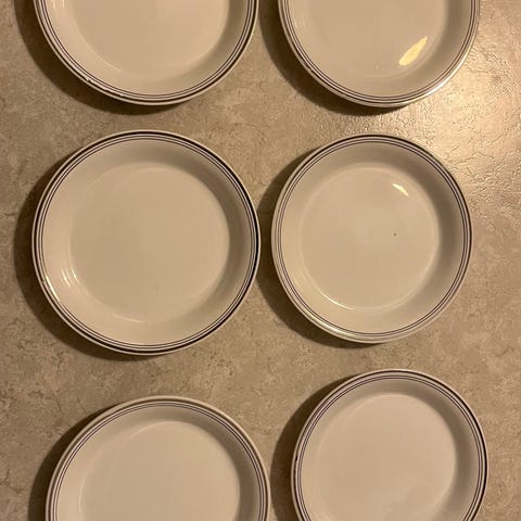 Ei iskemiä tai halkeamia. Käyttökuluma vaihtelee olemattomasta pieneen. Kuvassa olevassa yksittäisessä lautasessa sitä on eniten eli siinä pari hiusnaarmua ja koristeessa pientä kulumaa.