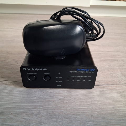 Cambridge Audio DacMagic Plus DAC. Tästä tyylikkäänä mustana kehuttu premium valmistajan dacci. Mukaan teline mahdollista pystyasennusta varten, virtajohto ja USB-johto.