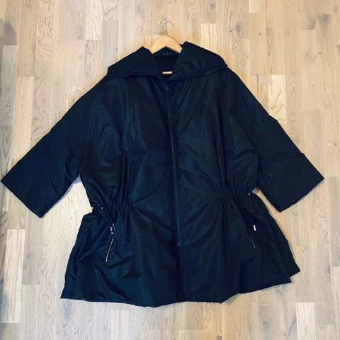 Kaksisuuntainen vetoketju ja nepparit. Läpälliset taskut neppareilla. Vyö.
