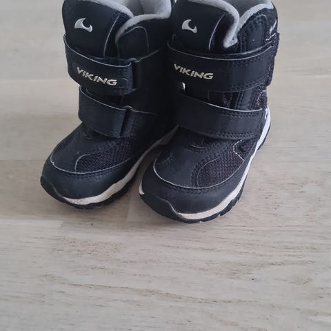Myydään korkeavartiset Viking Play II -talvikengät koossa 22. Kengissä vedenpitävä Goretex-kalvo. Olleet käytössä joulukuusta helmikuuhun, kunto hyvä ja kärjet ehjät (oikean kärjen päällä kuvassakin näkyvä "halkeama" pinnassa). Sisämitta 14 cm.