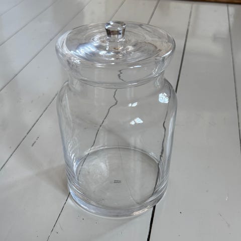 Kauniin muotoinen, käyttämätön lasipurkki, jossa on myös lasinen kansi. Kannessa olevan tiivisteen ansiosta siinä voi säilyttää vaikka pipareita ja ne säilyvät tuoreina.