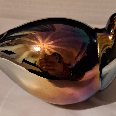 Kotimainen musta-valkoinen (siivissä vähän sinertävää) taidelasi lintu. Halkaisija n.11cm. Hinta 10 eur+ postikulut.
