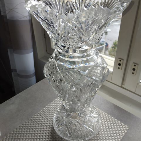 Näyttävä kristallivaasi. Maljakkoa ympäröi kaunis siniseksi epoksoitu fenix-aiheinen koriste.