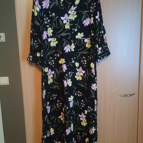 Objectin maximittainen, musta-valkoraidallinen mekko koossa M. Edessä koristenapit ja vyötäröllä nauhakiristys. Muutamia harvoja kertoja ollut käytössä. Kangas mielestäni siistissä kunnossa. Napeissa jotain kuvan mukaista hentoa jälkeä. Tahroja tai muuta ei arasta väristä huolimatta osunut kuvatessa silmiini, mutta takuuseen en uskalla mennä. Siistikuntoinen seuraavalle.