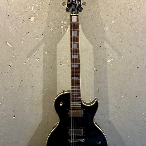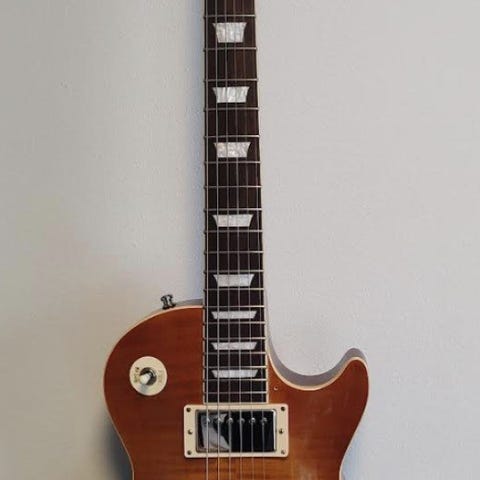 Vintage-ikäinen Japanin Aria. Kitara on alkuperäisessä kunnossa lukuunottamatta nauhoja, jotka on vaihdettu kerran 2020-luvulla. Mikit ovat Maxon MKK45 mallia ja molemmat noin 11,5 kOhm. Eivät siis mitkään PAF-kopiot vaan hieman kuumemmat. Kaula on helpposoittoinen ihan loppuun saakka. Kitaran rakenne on Les Paul -tyyppinen eli mahonkirunko, vaahterakansi ja mahonkikaula.