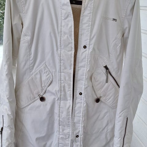Tummansininen, tosi lämmin ja hyvä takki kokoa 36. Ainut miinus on että vetoketjun yläosasta lähti muutama palanen irti pesussa josta myös kuva, mutta ei ole ainakaan minulla vaikuttanut käyttöön koska on niin korkea kaulus ettei tule sinne asti vedettyä vetoketjua.