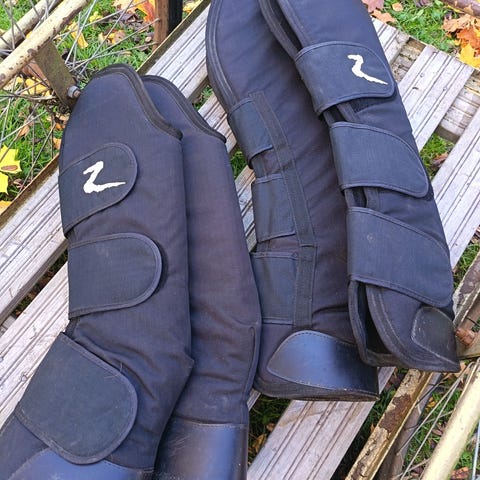 Myydään Horsewaren Rambo kuljetussuojat. Suojien alaosassa ulkopuolella nahkasuoja. Sisävuori raitafleecea. Pestyt.