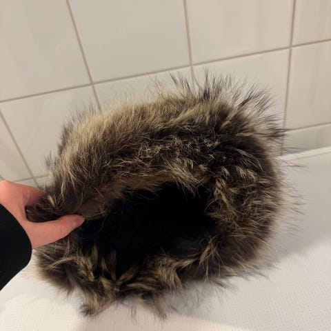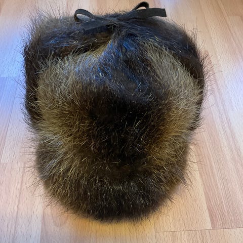 Harmaa mokkanahkaa ja turkista oleva hattu. Koko 59cm.