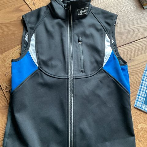 Kooveen tuulenpitävä liivi. Kaksi taskua, alareunassa kiristysnauha. Kokolappu on kulunut, mutta arvioisin, että L-koko kyseessä.