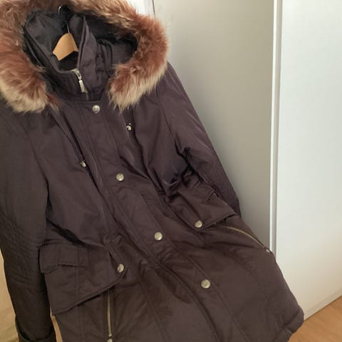 Upea desing takki. Karvareunainen huppu joka irroitettavissa. Nappikiinnitys. Suuret taskut