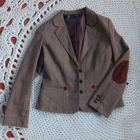 Tikatun jakun koko 42, rento sellainen. Siinä on lyhyt vyötärön yläpuolelle ulottuva helma ja pitkät kapeahkot hihat. Helman pituus on täydellinen runsaille sifonki ja laskomekoille ja hameille. edessä kaunis nauhakiinnitys. Toinen puoli on täysmusta, ei taskuja. Puuvillaa, vesipestävä.