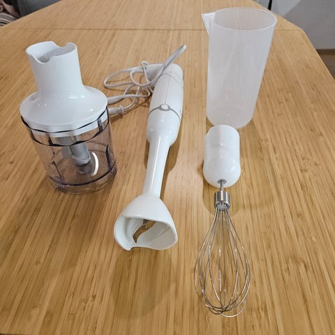 Tehosekoitin 8 €, lihamylly 8 €, raastin + kulho 7 €, vatkainosa 6 € ja kulhot 2 kpl 2 €/kpl. Kaikki yhteensä 20 €.