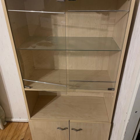 Ns. uusvanhan tyylinen lipasto, jossa kaksi pientä laatikkoa ja hyllytilaa lasiovien takana.
