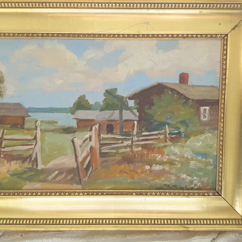 Kaunis öljymaalaus, aihe kukkaniitty ja valkoinen talo. Sign. Taimi Lilja -82. Koko 48x37cm, kirsikkapuukehykset. Nouto Sörnäisestä sovittuna ajankohtana.