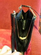 Laukussa on kullanvärinen kehysmekanismi ja lukko. Sametintapainen vuorikangas.