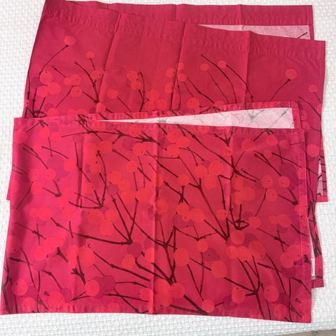 Myydään ompelijalla teetetty Marimekon Lumimarja-kuosinen valelaskosverho. Takapuolella yläreunassa tarranauha kiinnitystä varten. (kuva 3)