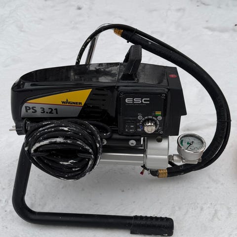 Wagner SuperFinish 21 Pro HEA -korkeapaineruisku. Korkeapainepistooli, 15 metrin letku ja ruiskusuutin mukaan. Korkeapainepistooliin 5 kpl suodattimia (kahta eri mallia). Käytetty kerran, ja sen jälkeen pesty 4 tuntia, eli on täysin puhdas ja valmiina käyttöön.