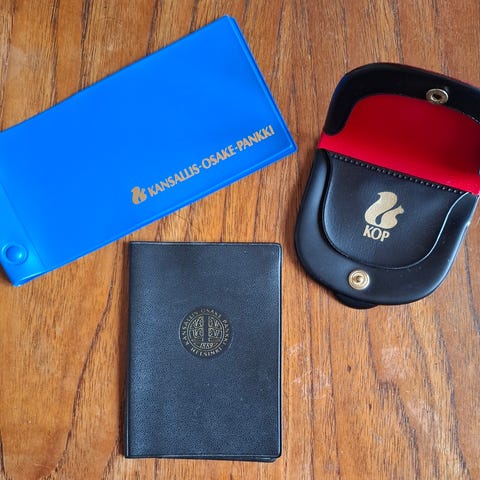 Myydään vanha hyväkuntoinen osuuspankin nahkakukkaro. Kulumaa hieman saumoissa. Kukkaron leveys 9 cm ja korkeus 8,5 cm. Hinta 3€.