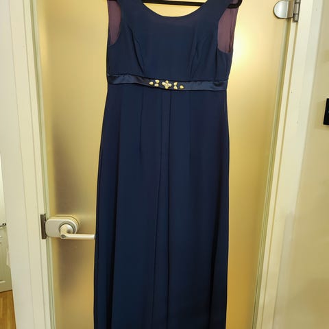 Tummansininen iltapuku, käytetty kaksissa juhlissa. Kokomerkintä xxl, vastaa vähintään 44 +, ja kokoa saa säädettyä selässä olevalla nyörityksellä. Itse ommeltu, nepparikiinnitteinen lisäkangas nyörityksen alla, jonka saa halutessaan pois, jos haluaa avaramman selkäosan.