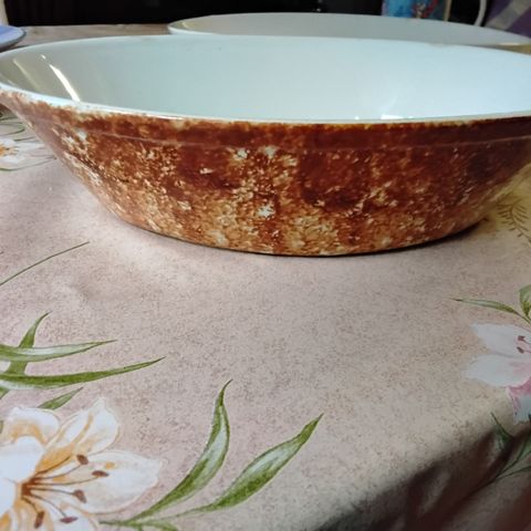Täysin ehjä, ainoastaan kuvien mukaista ajan patinaa ja uunin tuomaa ruskeaa väriä