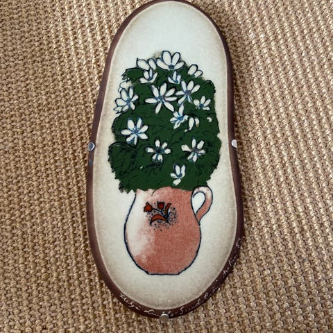 Arabia Seinälaatta Sateenvarjokukat, H L-S. Heljä Liukko-Sundströmin Arabialle suunnittelema kaunis seinälaatta nimeltään Sateenvarjokukat, vuosi 1991. Seinätaulun korkeus 23 cm.