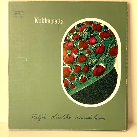 Arabia Seinälaatta Ruusupuu, Heljä Liukko-Sundströmin Arabialle suunnittelema kaunis seinälaatta nimeltään Sateenvarjokukat, 1990-luvulta. Seinätaulun korkeus 23 cm.