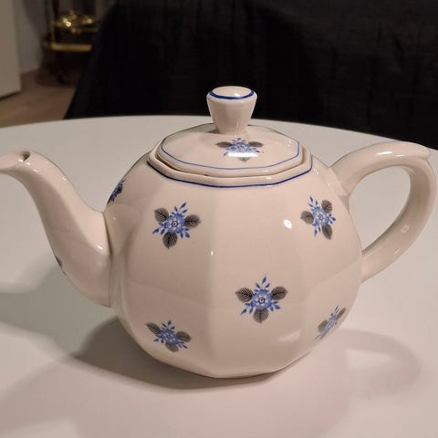 Vanha, mutta ihan hyväkuntoinen pieni teekannu. Kannessa pieni kolhu, joka näkyy kuvassa 3. Myös pientä teen aiheuttamaa tummentumaa kaatonokassa ja sisällä. Ei krakeloitumista.