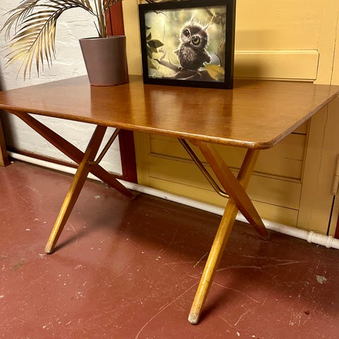 Sasus Playhousesta Porvoosta ostettu puinen teak pöytä mustilla metallijaloilla.