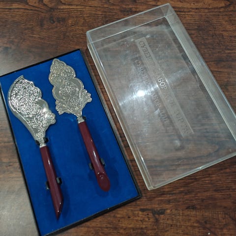 Kuvan vanhat, siistit kakkulapio ja -veitsi. Pituus n. 26cm. Valmistaja ulkomainen.