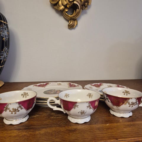 Posliininen kahvikuppisetti punaisilla ja kullanvärisillä koristeilla