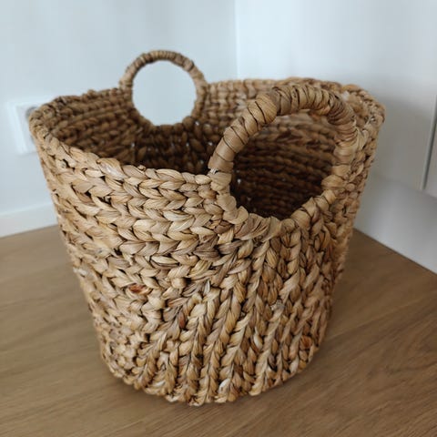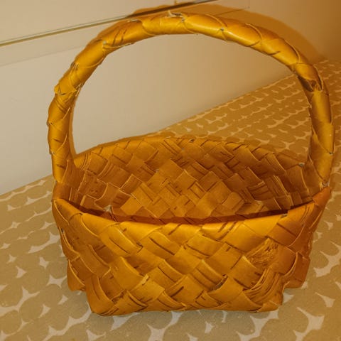 Alhaalta kapeampi vaalea kori. Kahvaa korjattu maalarinteipillä. Sievä. 6e.