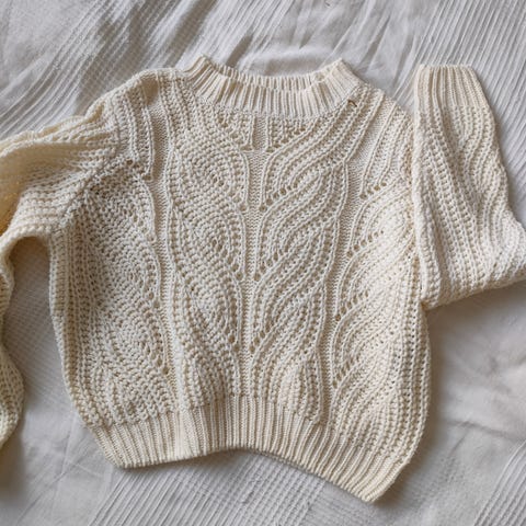 Kuvanmukainen neulepusero, kokoM vastaa kokoa S. 64% acryl, 26%villa,10%polyester.