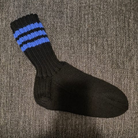 Mustat villasukat sinisillä raidoilla. 75% villaa ja 25% polyamidia. Koko n. 40-41, terän pituus n. 27cm.