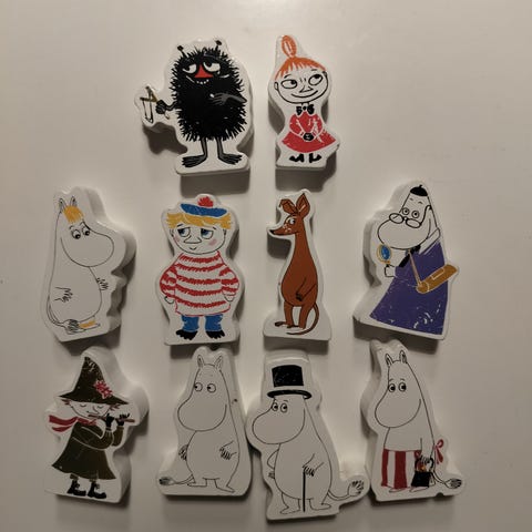 Kuvien pienemmät ( hahmosta riippuen n. 4-4,5 cm korkeat ) leikeissä mukana olleet muumihahmot.