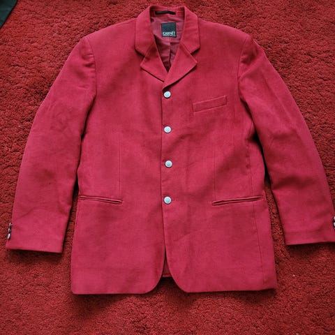 Musta villakangasbleiseri. Valmistettu Turkissa. Merkki Platin. Kokolapussa lukee 4XL, mutta älkää antako sen hämätä. Todellinen koko on XL.