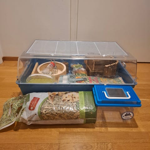 Häkki, kannessa iso luukku ja pitkällä sivulla myös. Kantokahvat päätyissä. Soveltuu esim. syyrialaiselle hamsterille. Pohjassa muutama jälki ja muutamasta reunasta nakerrettu. Ajaa kuitenkin asiansa. Pituus 83cm, syvyys 48 ja korkeus 44,50cm.