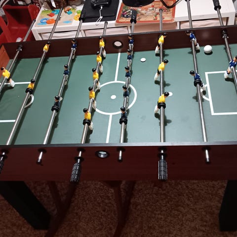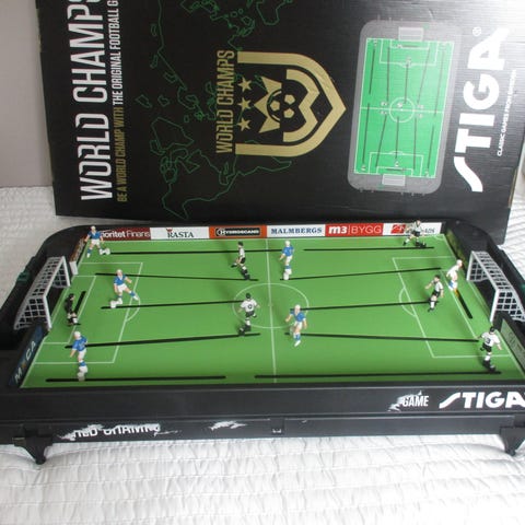 N. 70 vuotta vanha jalkapallopeli lelujen ja pelien keräilijälle. Peliä voi pelata lasi- tai metallikuulalla. (kuula puuttuu) Pelimiehet on taipuvia vieterin päässä olevia miehiä ja yksi pelaaja on katkennut.