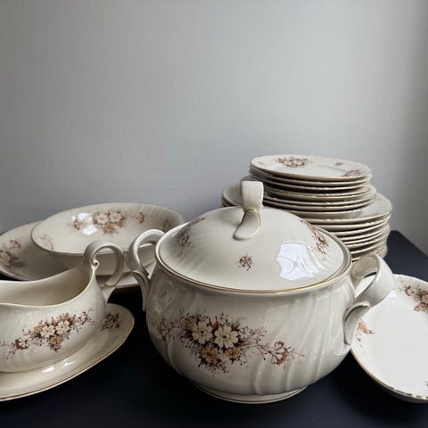 Erittäin hyväkuntoinen eli kuin uusi Arabian Raija astiasto. 12 hengen kupit,aluslautaset,kakkulautaset,sokerikko,kermakko ja kahvipannu. .kultaukset kuin uudet ja kukkakuvio ruskea.