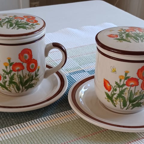 Kaksi isoa teekuppia asetteineen. Toisessa kupissa maalattuna mustikka- ja puolukka, toisessa punaherukka. Toisen aluslautasen reunamaalauksessa pientä kulumaa, muutoin astiat ovat kuin uudet. Paksua ja tukevaa ranskalaista posliinia. Kupin vetoisuus 4 dl. Hinta yhteensä 5 euroa.