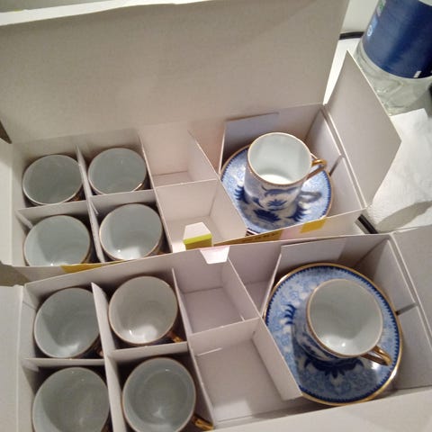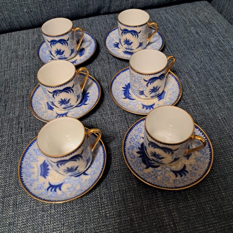 Myyn kuvan virheettömässä kunnossa olevat kahvikupit ja asetit sekä jälkiruokalautaset. Kolme settiä. Myyn kaikki kolme settiä yhdessä.