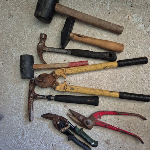 Setti työkaluja. Sisältää tonget, hohtimet, katkaisupihdit sekä viisi ruuvimeisseliä joista kolme ristipäätä ja kaksi tasapäätä.