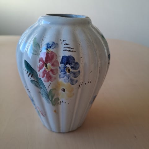 Käsinmaalattu maljakko. Ilmeisesti käytössä tullut pieni klommo. Tarjoa. Vain nouto Helsingistä.