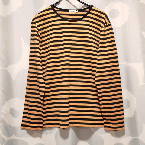 Marimekko Purismi raitapaita, koko L. Suoralinjaisessa paidassa on niukka istuvuus, ja paita sopiikin koolle S-L. Paita on valmistettu Puoliraita -kuosisesta, joustavasta puuvillaribbitrikoosta. Materiaali 95 % puuvilla ja 5 % elastaani. Pyöreä pääntie, jossa on resorikantti. 3/4-pituiset hihat. Paita on omaan makuuni turhan vartalonmyötäinen ja se onkin erinomaisessa kunnossa, pesty kerran.