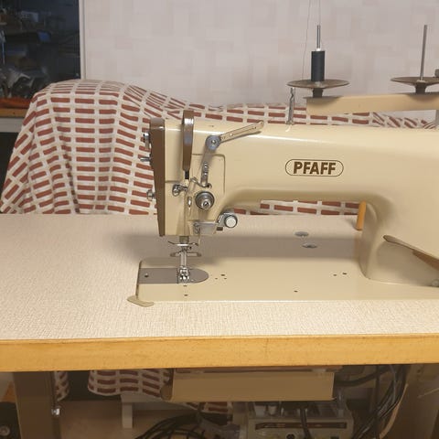 Teollinen ompelukone, joka on kiinnitetty tukevaan työtasoon. Mukana monipuoliset tarvikkeet, kuten langat, sakset ja muut ompeluvälineet. Sopii erinomaisesti ammattilaiskäyttöön tai vaativaan kotikäyttöön. Mukana myös erivärisiä ja -laatuisia kankaita, jotka soveltuvat monenlaisiin ompeluprojekteihin.