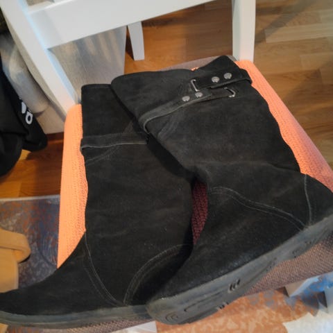 Ihanat mustat ylipolven saappaat koko 40. Takana venyke joten menee paksuillekkin pohkeille.
